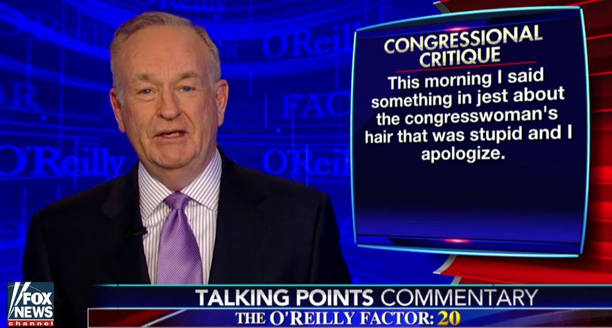 “I said in a simple jest that the congressman’s hair distracted me,” O’Reilly said. “Well, that was stupid. I apologize.”