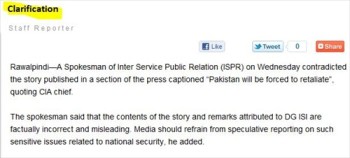 The Pakistan Observer published a clarification disclosing that an Interservice Public Relations spokesperson “contradicted” the newspaper’s story and claimed the story featured “factually incorrect and misleading”comments.