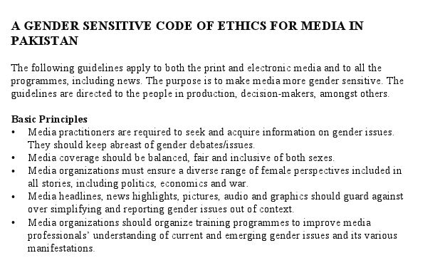 Aftab sent iMediaEthics a copy of the code, which is designated for print and electronic media. The code calls for media outlets to “seek and acquire information on gender issues,” and be “balanced, fair and inclusive of both sexes” in reporting, including in sourcing stories.