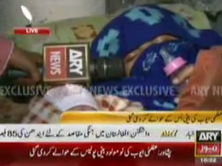 The Express Tribune reported that “hours after” Ayub gave birth, ARY News reporter Shazia Nasir “managed to get inside the hospital room” and interview Ayub on camera in her bed “live on national television.” See here a ARY News video interview with Ayub in her bed.