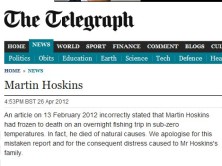 Three UK newspapers have apologized for wrongly reporting in February that a man named Martin Hoskins "had frozen to death...