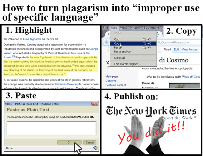 Fishbowl NY’s Richard Horgan busted Vogel’s article on July 28 for lifting from Wikipedia. He posted a side-by-side comparison of Vogel’s lede with the Wikipedia page for painter Piero di Cosimo, which showed word-for-word copy and pasting.