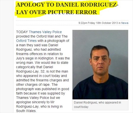 UK newspaper The Oxford Mail published a photo of the wrong person with a story about a man who “admitted the firearms charges and other charges of rape.” The Oxford Mail had published a photo of a 32-year-old man named Daniel Rodriguez-Lay instead of a photo of 38-year-old Daniel Rodriguez.