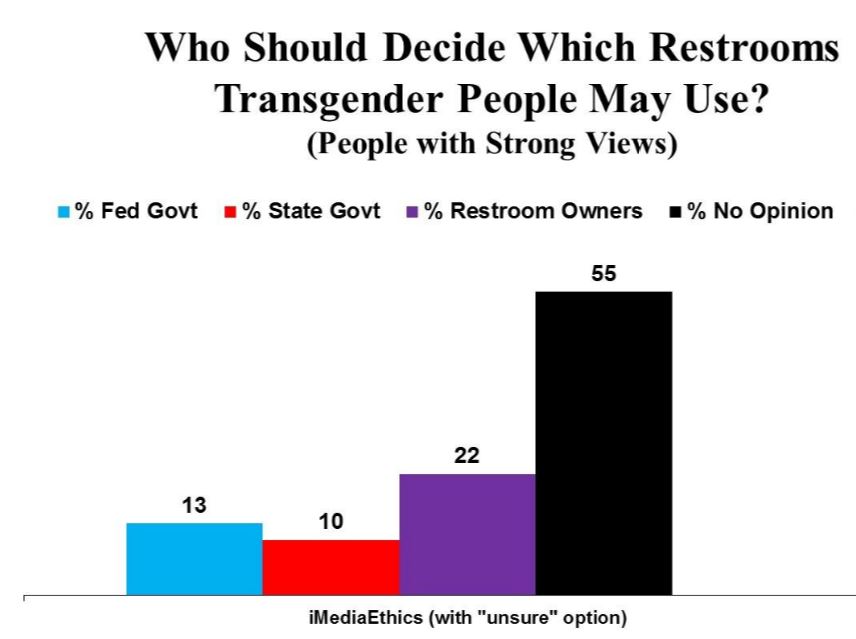 One of the main issues in the controversy over transgender people using restrooms based on their gender identity is this: Who should make the decision – the owners of the restrooms, the state, or the federal government? A new iMediaEthics poll examines the public’s preferences.