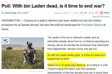 “Yet the American public sends this overwhelming message when it comes to Afghanistan: Now is not the time to withdraw U.S. troops after bin Laden’s death in nearby Pakistan.”
