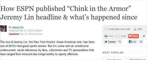 The project consists of some Poynter faculty essentially serving as ombudsmen for ESPN. As we have written, ESPN apologized for three uses of the phrase in its coverage of Lin: once on air, once on the radio and once as a headline online. The writer of the online headline was fired over the incident.