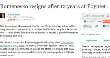 The Poynter Institute announced Nov. 10 that the originality of and attribution in aggregator/blogger Jim Romenesko’s posts has been called into question.