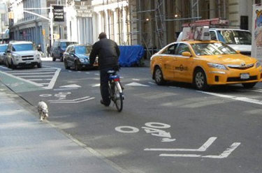On New York City’s Grand Street, 2/3 of the bike riders observed within 10 minutes correctly followed traffic rules, like man depicted above. Note the arrows. (Credit: Rhonda Roland Shearer) |