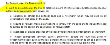 The conference also “condemned” everyone involved in hacking phones and bribing policy officers. iMediaEthics wrote to the Press Complaints Commission asking for comment on the motion. The PCC’s Jonathan Collett told us that “it wouldn’t be appropriate for the PCC to comment on the Lib Dem motion given our ongoing work with and contribution to the Leveson Inquiry.”