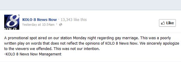 “A promotional spot aired on our station Monday night regarding gay marriage. This was a poorly written play on words that does not reflect the opinions of KOLO 8 News Now. We sincerely apologize to the viewers we offended. This was not our intention.”