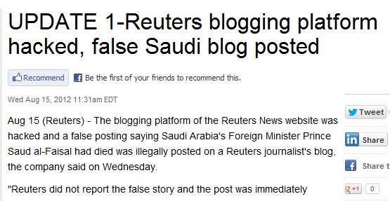 “Reuters.com was a target of a hack on Tuesday. Our blogging platform was compromised and a fabricated blog post saying Saudi Arabia’s Foreign Minister Prince Saud al-Faisal had died was illegally posted on a Reuters journalist’s blog on Reuters.com. Reuters did not report the false story and the post was immediately deleted. We are working to address the problem.”