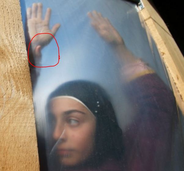 The full Reuters image with the extra thumb circled. How could Reuter’s claim be true–that the thumb is the only thing we see belonging to a “second girl” who is “largely hidden behind the wooden door frame”?