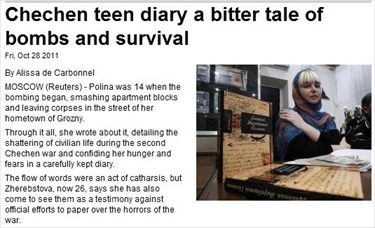 Elder’s article, “The second Chechen war: a Grozny teenager’s diary” was published by the Guardian Sept. 30. Alissa de Carbonnel’s article, “Chechen teen diary a bitter tale of bombs & survival” was published by Reuters Oct. 27 (and unpublished Oct. 28). StinkyJournalism notes that while Reuters has unpublished its U.S. web version of the story (the link now re-directs to a “Page Not Found” notice), Reuters’ Indian version still hosts the story in question.