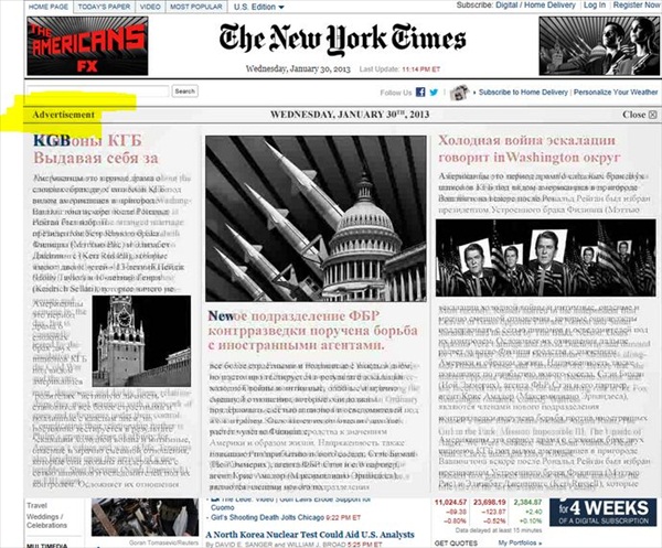 A little over a year after the New York Times was called out for a questionable Coca-Cola advertisement that wasn’t disclosed as such, the Times published a more transparent advertisement for new FX show The Americans.