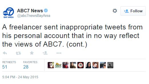 In a statement in response to iMediaEthics’ inquiry, KGO simply said: “A freelancer sent inappropriate tweets on his personal account that in no way reflect the views of ABC7. This freelancer is no longer associated with the station.”