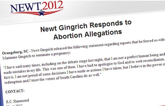 A second phony e-mail was sent purporting to be a press release from Gingrich’s campaign, according to CBS News. That press release included a quote from Gingrich on the “reports that he forced ex-wife Marianne Gingrich to terminate a pregnancy.”