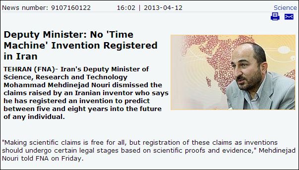 “UPDATE: Iran’s Deputy Minister of Science, Research and Technology Mohammad, Mehdinejad Nouri, on Friday denied that Razeghi has registered his ‘time machine’ with the State Organization for Registration for Strategic Inventions. The original report about the technology was pulled from an Iranian news agency website, the Washington Post reported.”