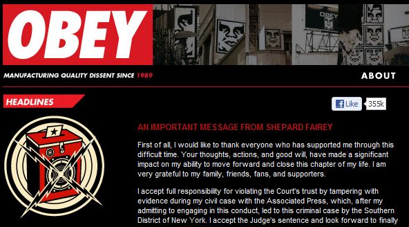 Fairey admitted this month that “I accept full responsibility for violating the Court’s trust by tampering with evidence during my civil case with the Associated Press.” Fairey added that he “believed, and still believe, that I had a very strong Fair Use case, which I could have prevailed,” but said he altered evidence because he was “embarrassed and scared.”