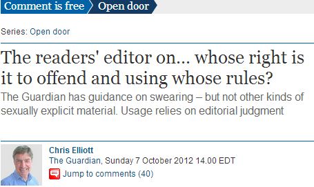 In an Oct. 7 column in response to reader complaints about sexual language in the newspaper, The Guardian’s readers’ editor Chris Elliott explained that the newspaper “has guidance about swearing — but not other kinds of sexually explicit material that may offend.”