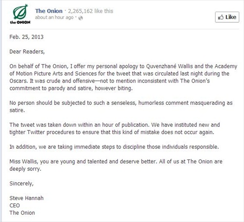 “On behalf of The Onion, I offer my personal apology to Quvenzhané Wallis and the Academy of Motion Picture Arts and Sciences for the tweet that was circulated last night during the Oscars. It was crude and offensive—not to mention inconsistent with The Onion’s commitment to parody and satire, however biting.