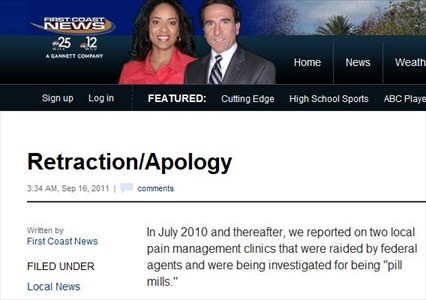 Jacksonville, Florida TV station First Coast News apologized Sept. 16 for inaccurately labeling a man named George H.G. Hall in its stories about “two local pain management clinics that were raided by federal agents and were being investigated for being ‘pill mills.'”
