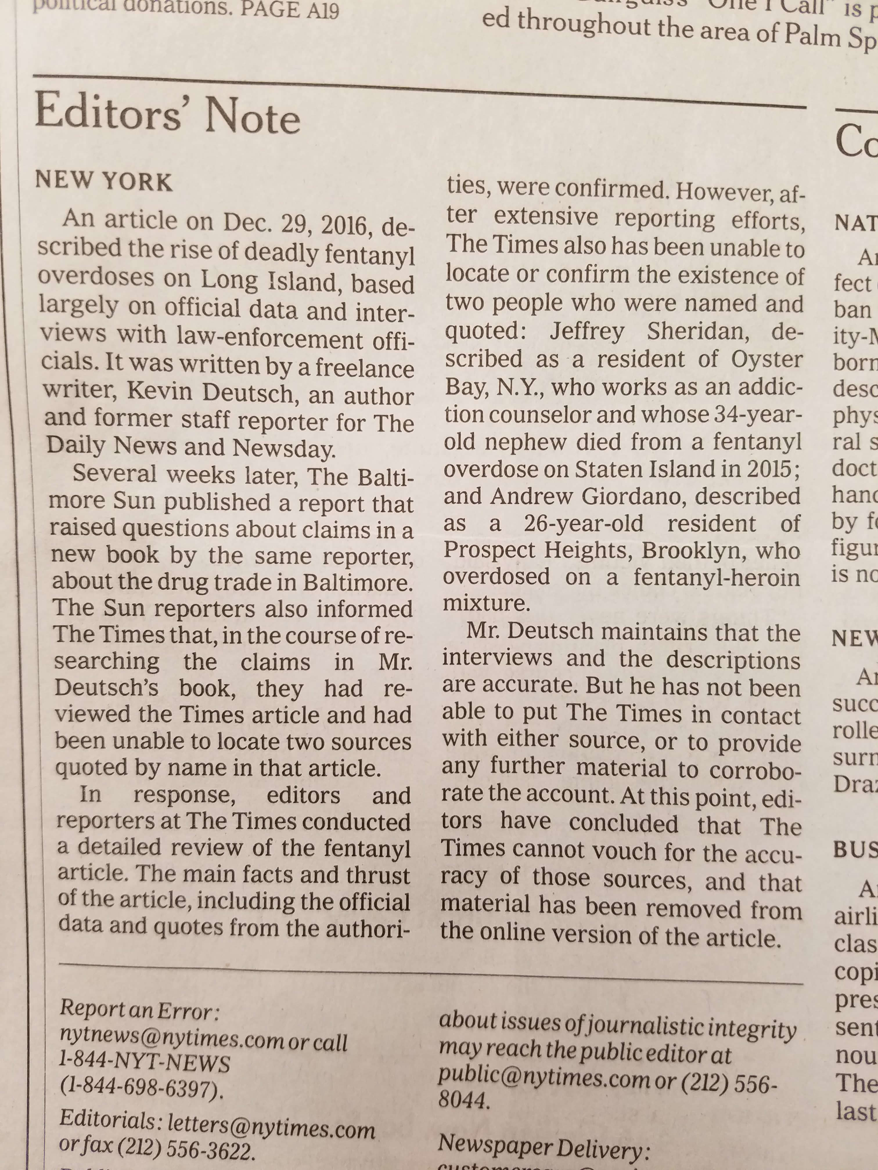 Baltimore Sun reporters had tipped the Times off because they were working on an article about Deutsch’s new book, Pill City. The Sun told the Times that they were not able to find two of the named sources in Deutsch’s Dec. 28 story, “Fentanyl Outpaces Heroin as the Deadliest Drug on Long Island.”