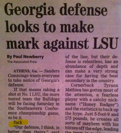 The expletive was inserted apparently randomly in an Associated Press sports article in between the second and third paragraph of the story. The article, “Georgia Defense Looks to Make Mark against LSU,” is written by the Associated Press’s Paul Newberry. The article does not appear to be published on the Greenville News’ website. See above, a screenshot of the article.