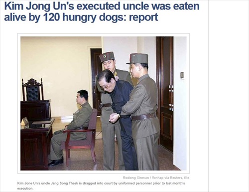 “The account of the country’s second-in-command Jang Song Thaek, 67, being stripped naked, thrown into a cage and eaten alive by 120 ravenous hounds, circulated throughout major American media last week.