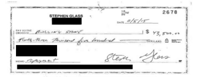 Glass sent iMediaEthics one of the canceled checks he sent to a news outlet.