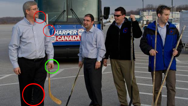 See iMediaEthics’ above mark-up of the image. The green circle shows what made the reader suspicious. The red circles indicate that a second person is standing directly behind Canadian prime minister Stephen Harper, the man on the left side foreground. A man standing behind Harper is holding a hockey stick.