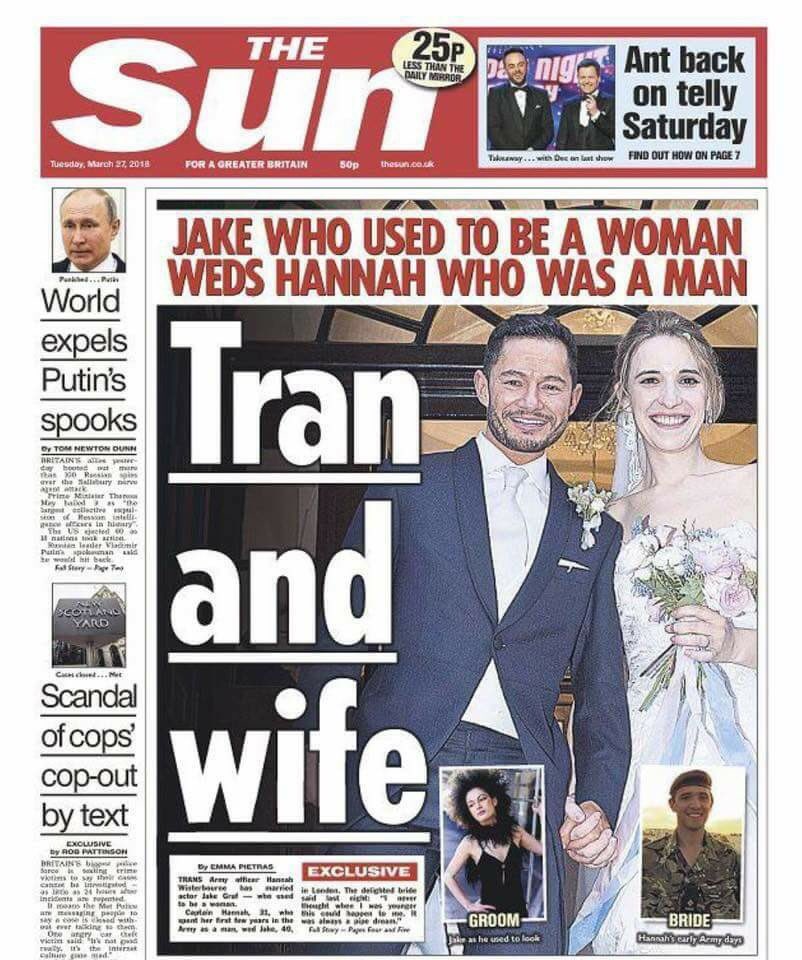 The UK Sun upset readers when it published a front page story on a transgender couple who got married. Why? Because the headline was “Tran and wife: Jake who used to be a woman weds Hannah who was a man.”