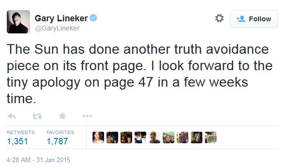 “The Sun has done another truth avoidance piece on its front page. I look forward to the tiny apology on page 47 in a few weeks time,” he tweeted.