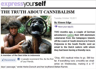The Oct. 18 Daily Express article titled “The Truth about Cannibalism” accused residents of Nuku Hiva on the Marquesas Islands of sexual assault and cannibalism. According to the Express, in August 2011, a German couple, Heike Dorsch and Stefan Ramin, went to the island. Dorsch claims a man named Henri Haiti “chained her to a tree and sexually assaulted her” after he took Ramin to the forest. The Express went on to report that unnamed “investigators think these were the remains of a human body roasted and eaten by cannibals.” But, the Express didn’t note which investigators or where they are from. The Express also noted that the body parts haven’t been identified as Ramin’s, but “are being tested.”