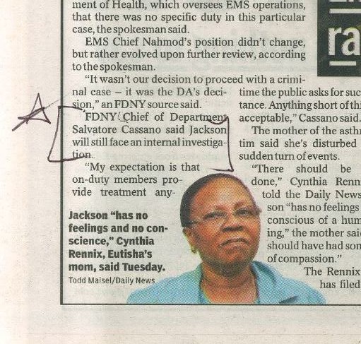 The New York Times and The New York Daily News had errors in their stories about charges being dropped against Melisa Jackson, an EMT who refused to help a dying pregnant woman, Eutisha Reveé Rennix, while on a coffee break at a Au Bon Pain restaurant in Brooklyn, New York.
