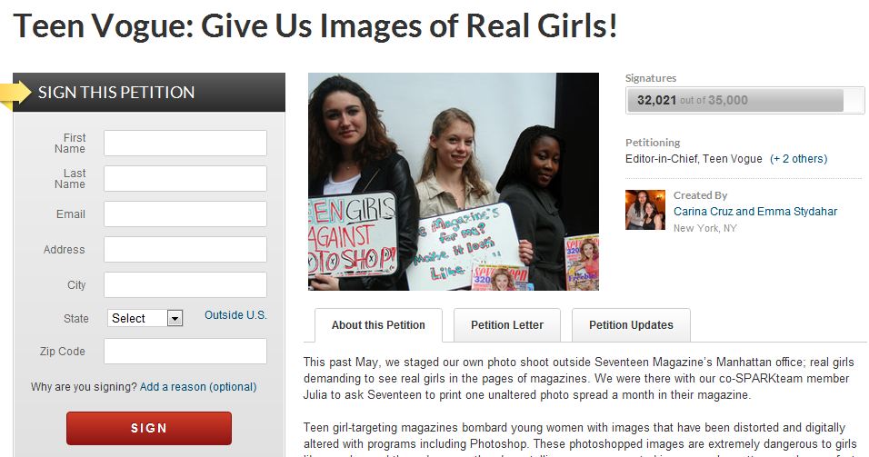 Following her success, two others started a petition calling for Teen Vogue to “give us images of real girls!” That petition passed its goal of 25,000 signatures with more than 32,000.