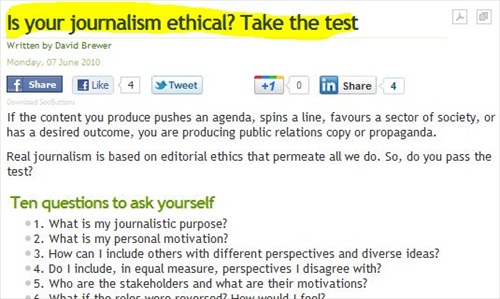 Media Helping Media published a quiz for journalists to determine test your media ethics or find if work is ethical. Some questions posed to journalists include asking what motivation and purposes the journalists have and if journalists “include, in equal measure, perspectives that I disagree with.”