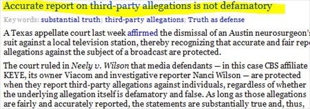 In this particular case, CBS-affiliate KEYE “discussed” two lawsuits and “a 2003 disciplinary action” against Dr. Byron Neely and his “professional association” Byron D. Neely, P.A. “Neely declined to be interviewed for the broadcast. However, Neely’s medical-malpractice counsel and his counsel in the Board proceedings both spoke to Wilson and supplied her with materials and information favorable to Neely.”