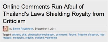 Under the laws, a California man, Anthony Chai, may be prosecuted for comments he made several years ago anonymously “on a now-defunct website, a forum for expatriate Thais,” PBS Media Shift reported. Chai’s identity was revealed because “Thailand’s cyber-watchdogs” contacted the website hosting company, which turned over his information “without recourse to the proper subpoena procedures.”