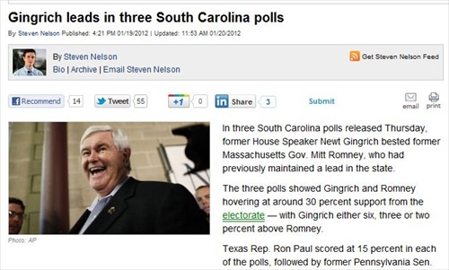 Or note the announcement from the Daily Caller: “Gingrich Leads in 3 South Carolina Polls.” This announcement refers to polls by PPP (a 6-point lead for Gingrich), InsiderAdvantage (a 3-point advantage), and Rasmussen Reports (2-point lead).