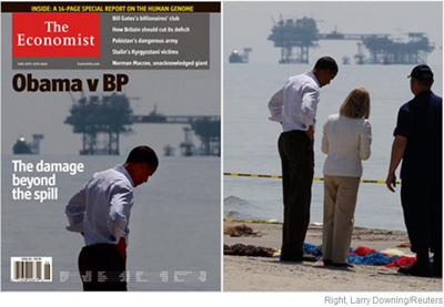 The cover photograph shows a lonely Obama on the beach looking down as if in deep thought. The headlines state: “Obama v BP” and “the damage beyond the spill.”
