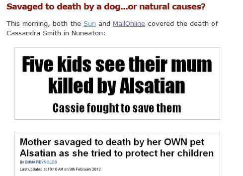 The Sun and the Daily Mail each apparently unpublished articles claiming that a woman named Cassandra Smith was killed by her pet Alsatian dog when she was trying to defend her children, Tabloid Watch reported.