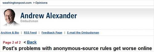 The Washington Post's public editor, Andrew Alexander, criticized Post bloggers for disregarding the Post's standards on anonymous sources. "Staff-written news...