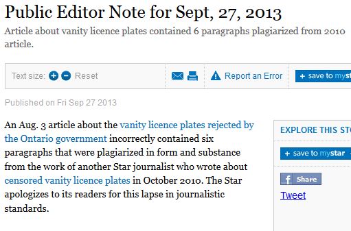 “Public Editor Note – Sept. 30, 2013 : This article about the vanity licence plates rejected by the Ontario government incorrectly contained six paragraphs that were plagiarized in form and substance from the work of another Star journalist who wrote about censored vanity licence plates in October 2010. The Star apologizes to its readers for this lapse in journalistic standards.”