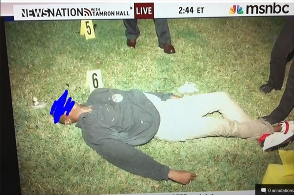 According to graphics shown in the image, which shows Martin lying on the grass dead with what appears to be crime scene markers and the feet of two other people standing nearby, the image was shown on News Nation with Tamron Hall at 2:44 ET.