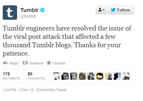 “Tumblr engineers have resolved the issue of the viral post attack that affected a few thousand Tumblr blogs earlier today. Thank you for your patience.”