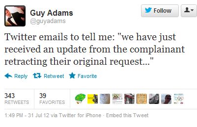 Earlier this week, Twitter suspended the account of Independent journalist Guy Adams for tweeting the email address of NBC Olympics president Gary Zenkel, Reuters reported.