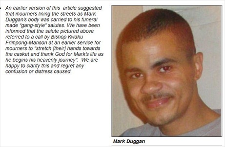 “An earlier version of this article suggested that mourners lining the streets as Mark Duggan’s body was carried to his funeral made ‘gang-style’ salutes. We have been informed that the salute pictured above referred to a call by Bishop Kwaku Frimpong-Manson at an earlier service for mourners to ‘stretch [their] hands towards the casket and thank God for Mark’s life as he begins his heavenly journey’. We are happy to clarify this and regret any confusion or distress caused.”