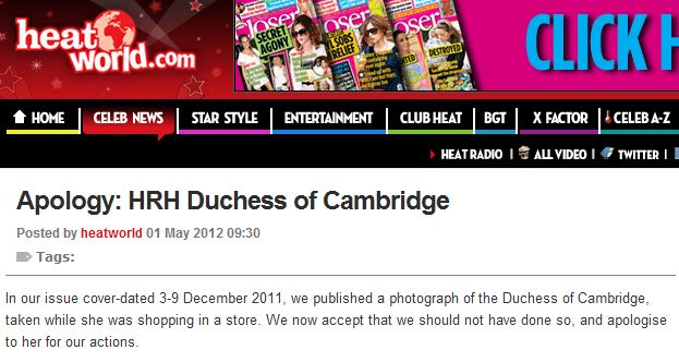 UK magazine Heat apologized to Kate Middleton for a December photo of her shopping, the Press Complaints Commission reported.