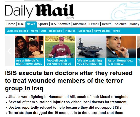 The Mail’s April 10 story was titled, “Killed with a bullet to the head: ISIS execute ten doctors after they refused to treat wounded members of the terror group in Iraq.”