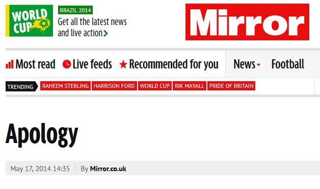 The Mirror also published an apology on May 17 on its website. The apology states:
